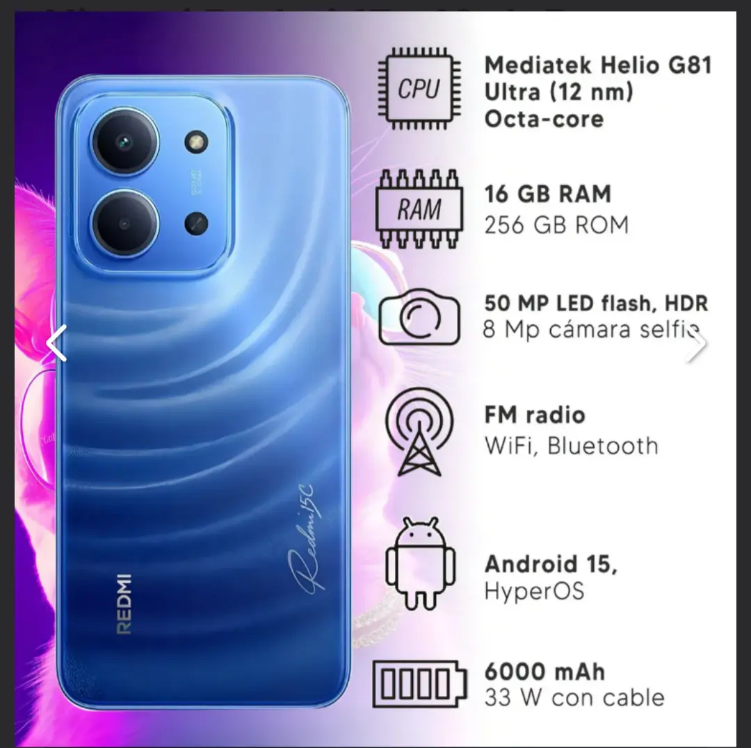 Xiaomi Redmi 15C 16/256 Gb El Xiaomi Redmi 15C es un smartphone de gran precio y prestaciones, con una gran batería de 6.000 mAh y carga rápida de 33W, pantalla IPS LCD de 6,9 pulgadas a 120 Hz y resolución HD+, procesador MediaTek Helio G81, cámara principal de 50 MP, y sistema operativo Android 15 con HyperOS. - Equipo libre para todas las compañías - Pantalla 6.9" LCD IPS, 120 Hz resolución 720 x 1600 píxeles relación de aspecto 20:9 (densidad de ~254 ppp) - Sistema Operativo Android 15, HyperOS 2 - Procesador Mediatek Helio G81 Ultra (12 nm) Octa-core (2x2,0 GHz Cortex-A75 y 6x1,8 GHz Cortex-A55) Mali-G52 MC2 - Ranura de Tarjeta: microSDXC (ranura dedicada) - Memoria RAM: 16GB (8 Físicas + 8 de Asistencia Virtual) - Almacenamiento interno: 256 Gb - Cámara principal: Flash LED, HDR. 50 MP, f/1.8, 28 mm (gran angular), 1/2.76", 0.64 µm, PDAF QVGA, f/3.0. Video 1080p a 30 fps - Cámara Selfie HDR 8 MP, f/2.0, (gran angular), 1/4.0", 1,12 µm. Video 1080p a 30 fps - Conector de 3,5 mm: sí - Altoparlante: sí - Wi-Fi 802.11 a/b/g/n/ac, doble banda - Bluetooth 5.4, ??A2DP, LE - GPS, GLONASS, GALILEO, BDS - NFC: no - Radio FM - USB Tipo-C 2.0, OTG - Huella dactilar (lateral), acelerómetro, brújula, Detección de proximidad virtual - Batería 6000 mAh 33 W con cable, PD - Medidas: 17.16 x 7.95 x 0.8 cm | Peso 205 g